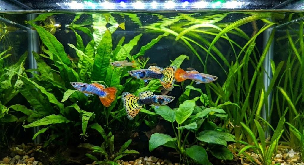 Guppies are peaceful, active fish that spend most of their time swimming near the top of the tank. They are constantly on the move, searching for food and interacting with each other. They are social fish and get stressed if kept alone. They should be kept in groups of at least a trio (ideally one male to two females to prevent males from harassing a single female too much). They are excellent “dither fish” that encourage shyer species to come out of hiding.